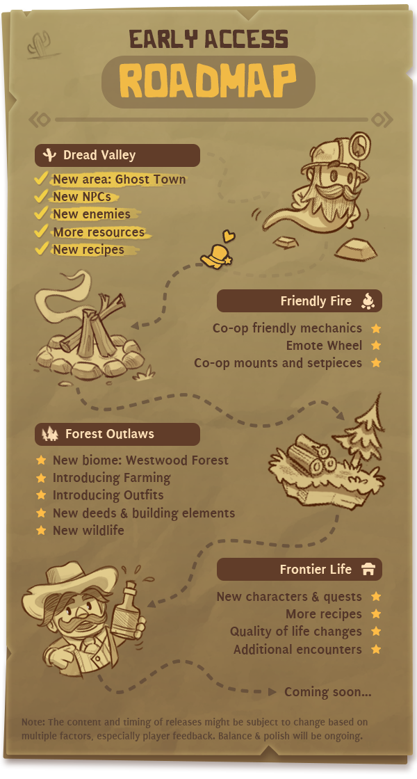 “We are constantly working on expanding the world of Don't Die in the West with new quests, biomes, characters, and cowboy activities. We have a ton of features we want to add, but we also want to hear from you what you think is most important. We have a “living roadmap” that you can find on the store page that outlines some of the features we want to add, and a rough timeline of their release.”