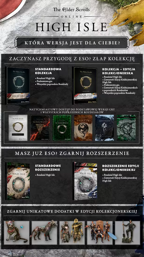 Kolekcja – zawiera podstawową wersję gry, rozdział High Isle z roku 2022 oraz WSZYSTKIE poprzednie Rozdziały (Morrowind, Summerset, Elsweyr, Greymoor i Blackwood)