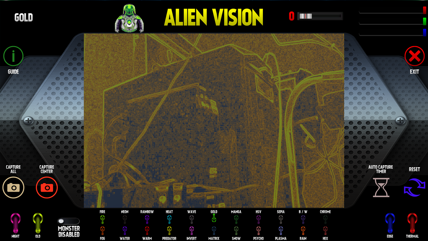 Alien Vision is a software used to view images of oneself and objects in various unique forms using four modes of visions viz. Night, OId TV, Edge and Thermal, either individually or in combination with 22 secondary visual effects.