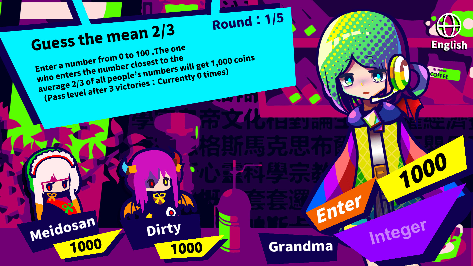 Enter a number from 0 to 100 .The one who enters the number closest to the average 2/3 of all people’s numbers will get 1,000 coins.