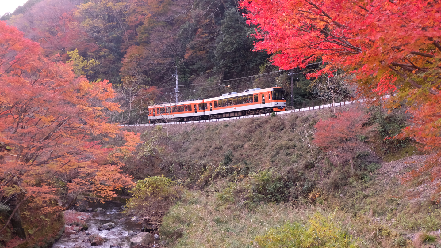 The train runs from the city to the mountainous region, passing through beautiful scenery, including the "Maple Tunnel," famous for its autumn leaves.