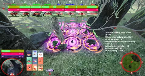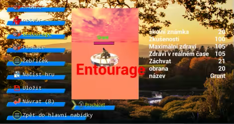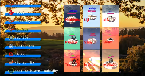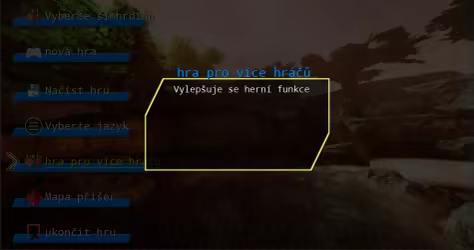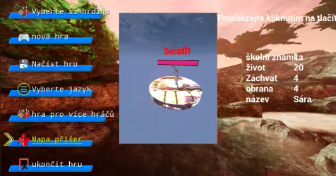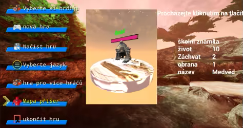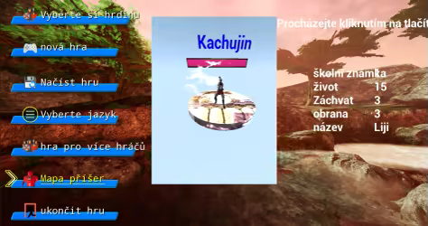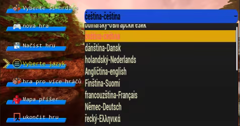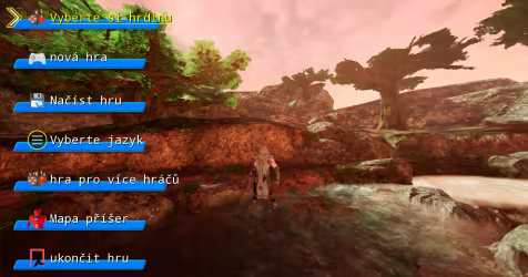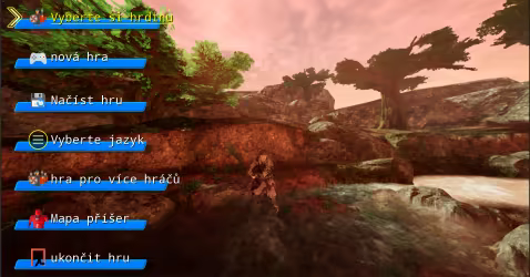 Hlavní nabídka obsahuje výběr hrdiny, novou hru, načítání, výběr jazyka, hru pro více hráčů, mapu příšer a ukončovací hru.