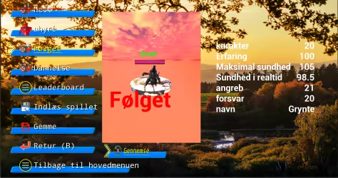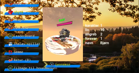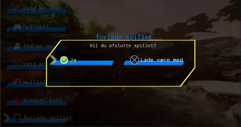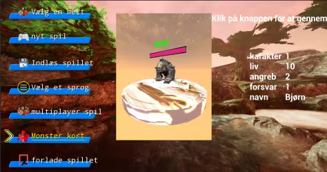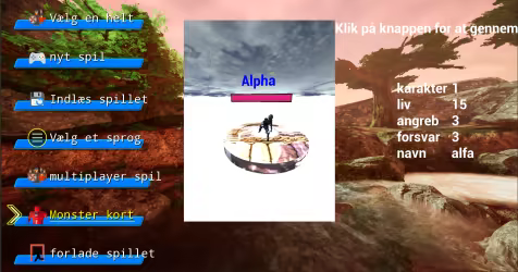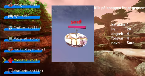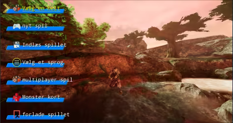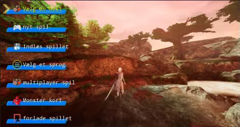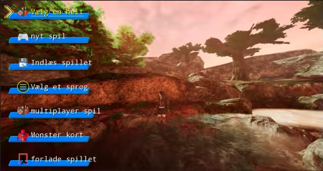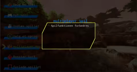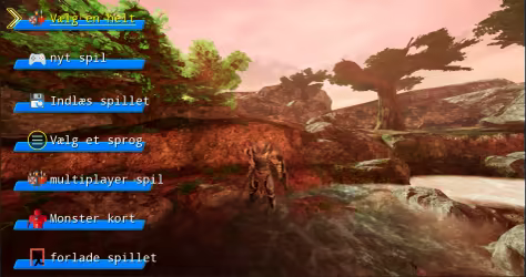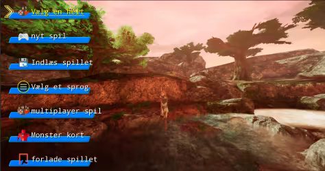Hovedmenuen indeholder valg af helte, nyt spil, indlæsningsspil, sprogvalg, multiplayer -spil, monster -kort og exit -spil.