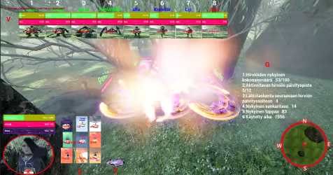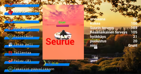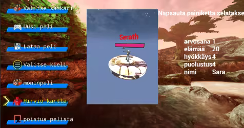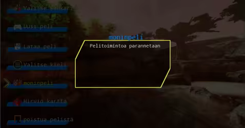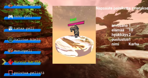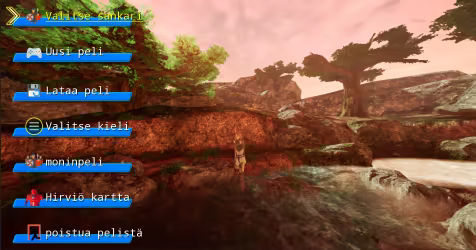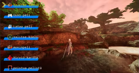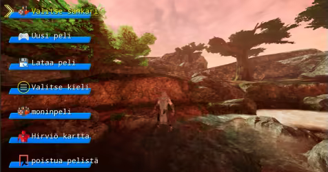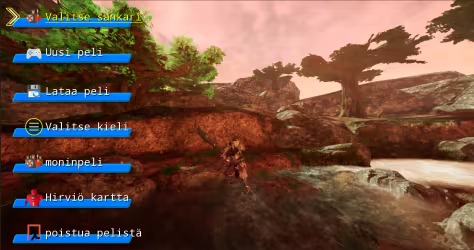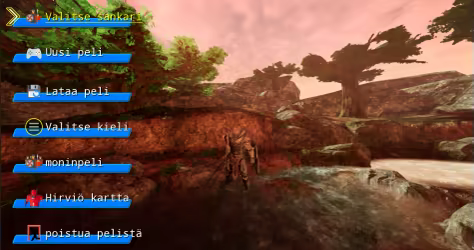 Päävalikko sisältää sankarivalinnan, uuden pelin, latauspelin, kielivalinnan, moninpelin, hirviökartan ja poistumispelin.
