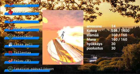 Avaa taukokäyttöliittymä painamalla Esc tai P. Valikko sisältää: sankari, hirviö, seurue, kokoonpano, tulostaulukko, lataa peli, tallenna, palaa (B) ja palaa päävalikkoon.