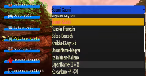 Valitse pelin käyttöliittymässä käytettävä kieli napsauttamalla Valitse kieli. Peli tukee yhteensä 24 kieltä. Kieli voidaan valita näppäimillä W, S tai ylös ja alas. Kuten alla: