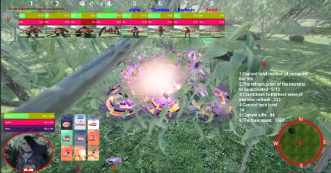 This is a third-person 3D real-time battle game. Players can choose different heroes, use different skills to kill monsters, gain experience and followers. The enrolled followers can be arranged in different formations to fight with the heroes. There are red monster refresh points on the map, and some monsters will be refreshed at regular intervals. When the total number of monsters exceeds 100, the game fails. When the hero level reaches level 10 and multiples of level 10, the challenge is successful, and then the player can choose to continue the challenge or quit the game. The hero only needs to stand on the red refresh point for a certain period of time to turn the refresh point into green. At this time, the monster's refresh time will be extended. When the hero is upgraded, the hero's level, ranking and time used will be recorded on the leaderboard. The time is in seconds. The main interface of the game is shown below: