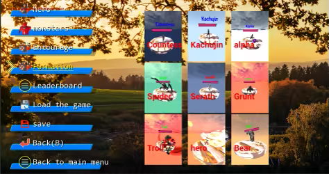 Press Esc or P to bring up the pause interface. The menu includes: hero, monster, entourage, formation, leaderboard, load game, save, back(B), and return to the main menu.