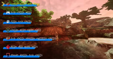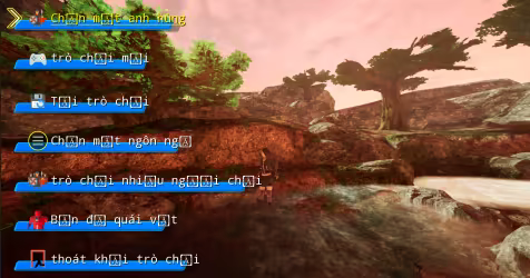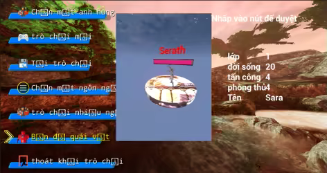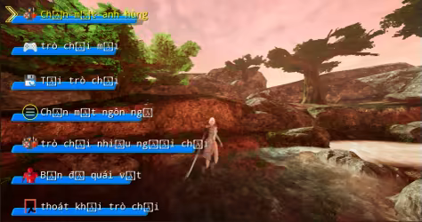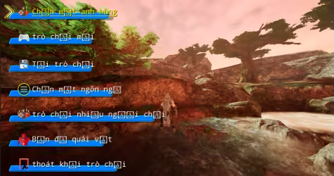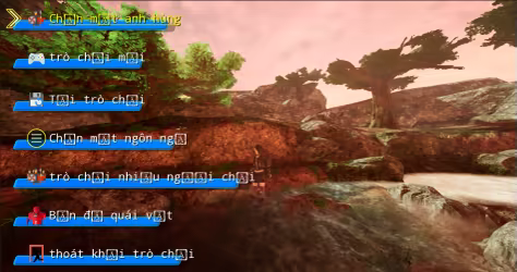 Menu chính bao gồm lựa chọn anh hùng, trò chơi mới, tải trò chơi, lựa chọn ngôn ngữ, trò chơi nhiều người chơi, bản đồ quái vật và thoát trò chơi.