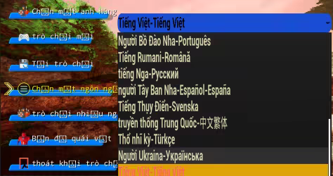 Nhấn Chọn Ngôn ngữ để chọn ngôn ngữ sử dụng trong giao diện trò chơi. Trò chơi hỗ trợ tổng cộng 24 ngôn ngữ. Có thể chọn ngôn ngữ bằng phím W, phím S hoặc phím lên và xuống. Như hình bên dưới: