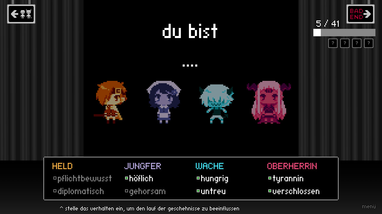 die entscheidungen, die du in einer geschichte triffst, wirken sich auf die anderen aus. du kannst diese verhaltensweisen umschalten, um neue pfade zu eröffnen! leider führt jeder pfad zu einem schlechten ende...