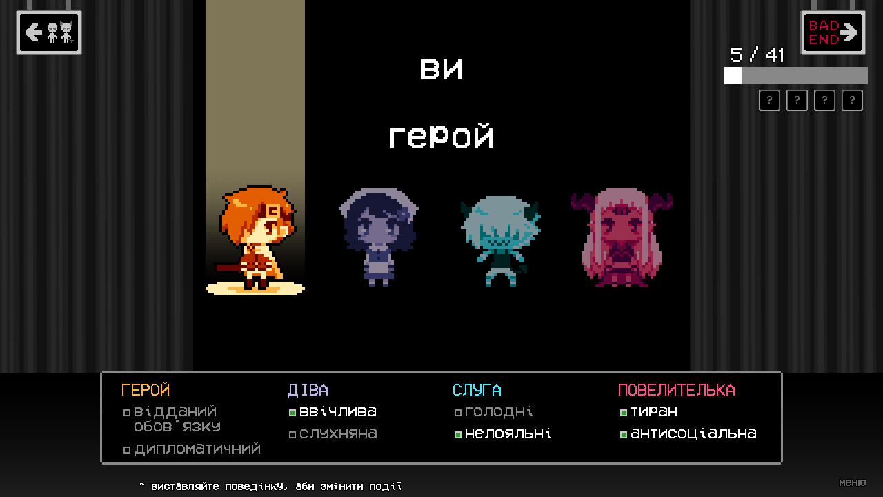 рішення, що ви приймаєте в одній історії, вплинуть на інші. ви можете виставляти поведінку, аби відкрити нові шляхи! на жаль, кожен шлях веде до поганого кінця...