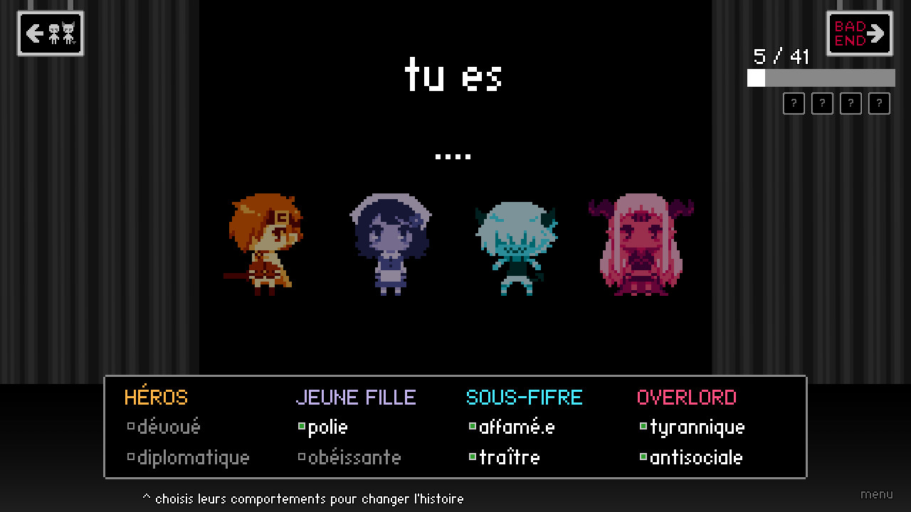 les décisions que tu feras dans une histoire affectera les autres. tu peux modifier ces comportements pour ouvrir de nouvelles possibilitées! malheureusement, toutes finissent par une mauvaise fin...