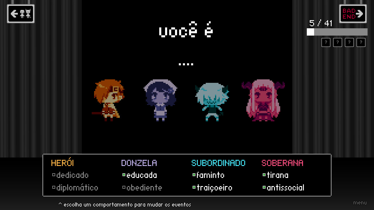 as escolhas que você faz em uma história, afetam as outras. você pode mudar os comportamentos para abrir novos caminhos! infelizmente, todos os caminhos levam a um final infeliz...