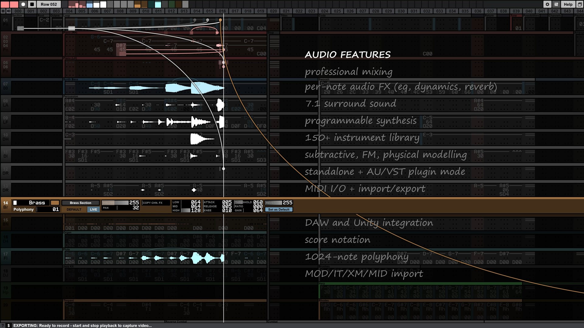 • Advanced MIDI-compatible, pattern-based sequencer, supporting tracker and score notation views, with mixing and effects processing.
