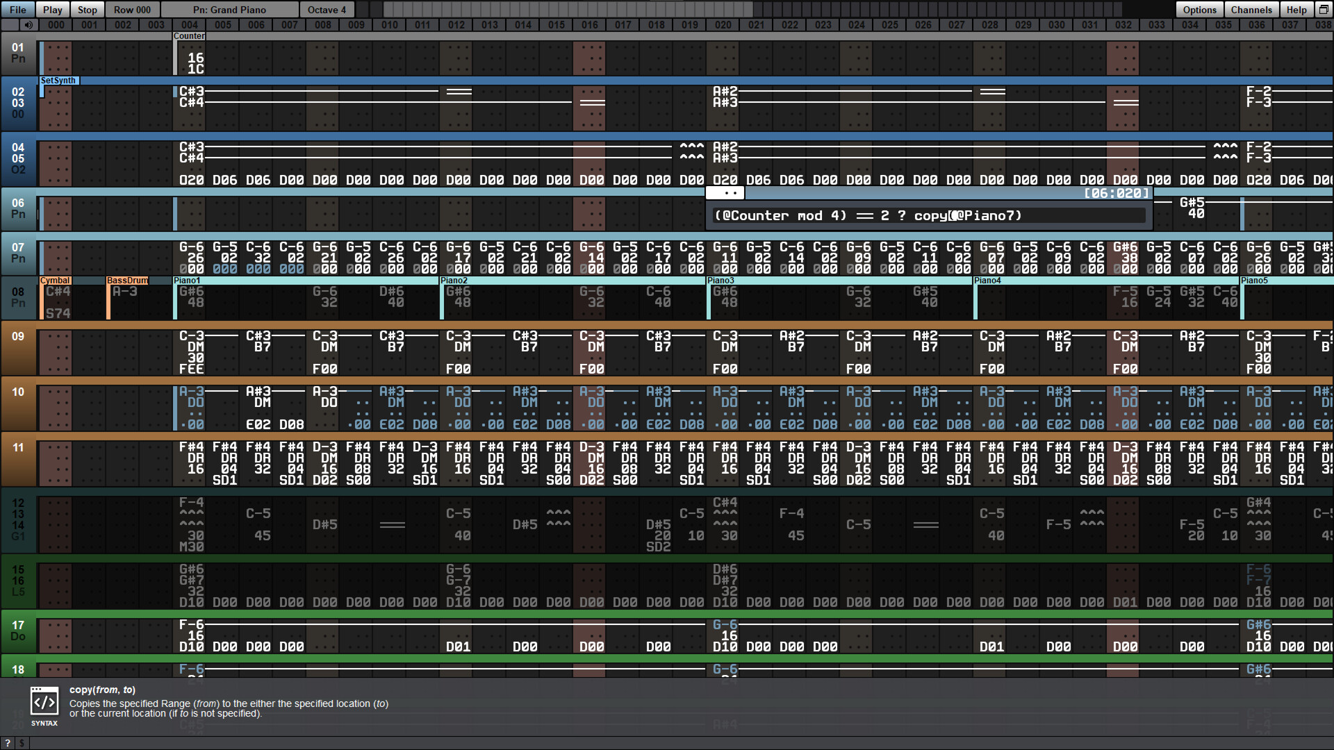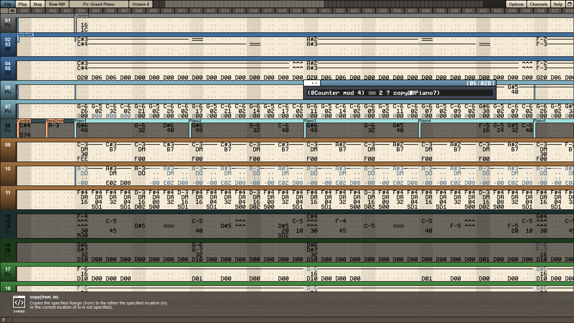 The base program is designed to work 'out-of-the-box' and provide everything required to produce complete and complex musical works, but is specifically designed to foster engagement with music programming (over conventional editing practices) by intentionally limiting the amount of music you can sequence manually (to one pattern) and disabling sample/instrument editing, to focus attention on the code and music respectively. Cunning users may never need more than this, as code makes it possible to exploit the patterns and processes of music to capture entire pieces in a single pattern, from dance hits to orchestral scores (see the program for examples!).