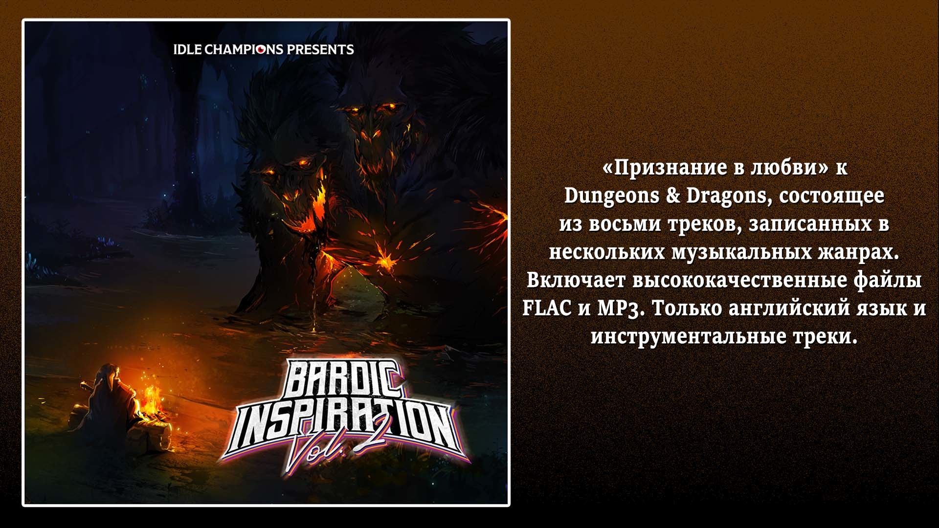 Благодаря вокальным талантам Джейсона Чарльза Миллера и Хоуп Лавель Bardic Inspiration Volume 2 станет идеальным музыкальным сопровождением для подготовки к вашей следующей игровой сессии Idle Champions или Dungeons & Dragons.