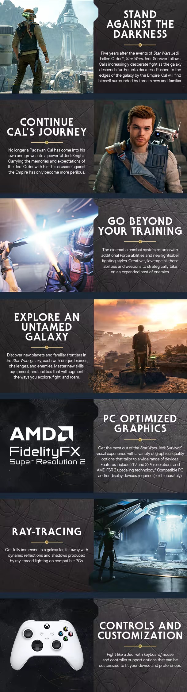 The story of Cal Kestis continues in Star Wars Jedi: Survivor™, a third-person, galaxy-spanning, action-adventure game from Respawn Entertainment, developed in collaboration with Lucasfilm Games. This narratively driven, single-player title picks up 5 years after the events of Star Wars Jedi: Fallen Order™ and follows Cal’s increasingly desperate fight as the galaxy descends further into darkness. Pushed to the edges of the galaxy by the Empire, Cal will find himself surrounded by threats new and familiar. As one of the last surviving Jedi Knights, Cal is driven to make a stand during the galaxy’s darkest times — but how far is he willing to go to protect himself, his crew, and the legacy of the Jedi Order?