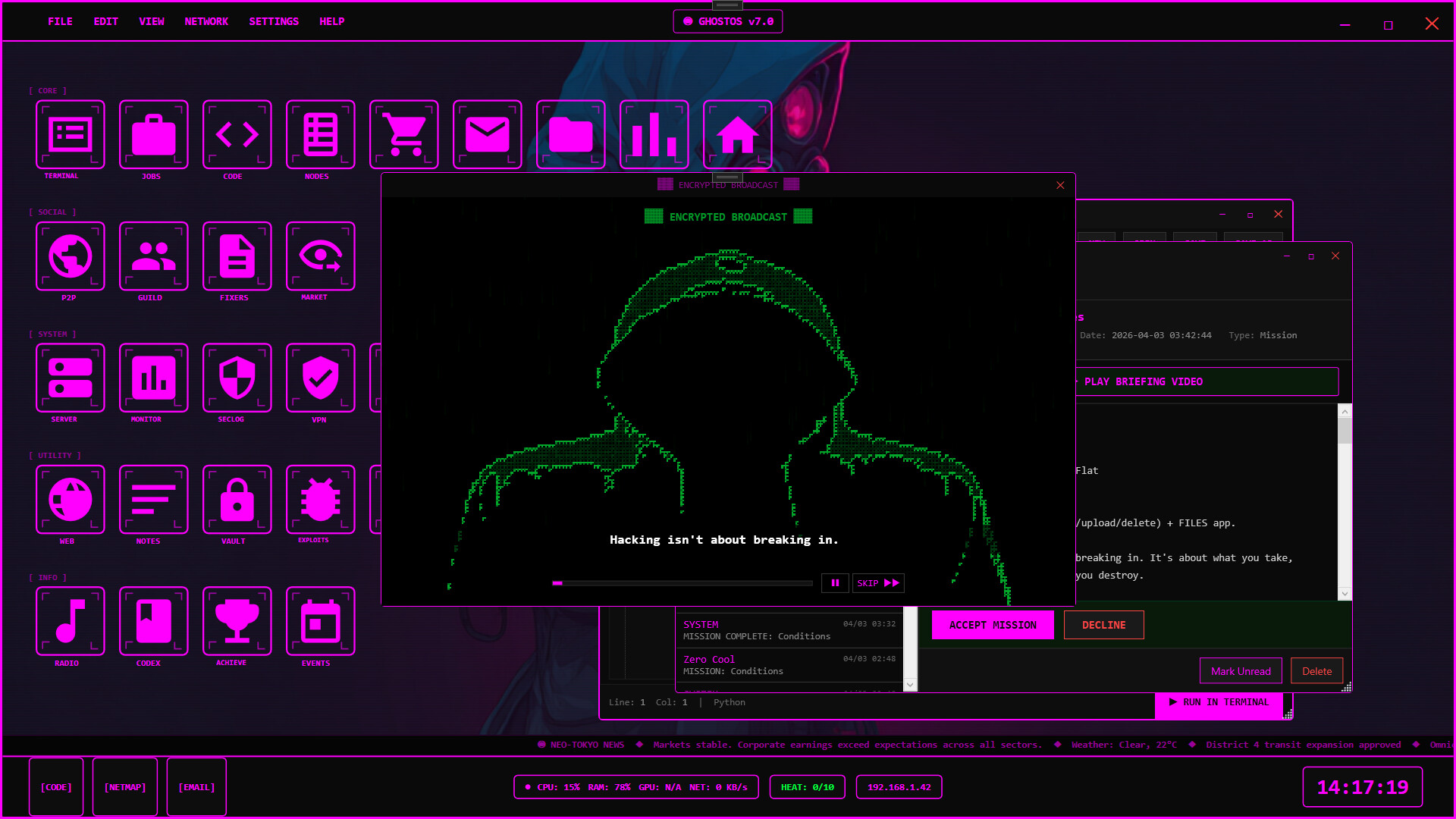 Ghost Network: Dark Hacker is a cyberpunk hacking simulation built around GhostOS — a fully simulated desktop operating system. Every hack, every mission, every piece of intel flows through apps on your screen. You're not pressing "HACK" buttons. You're writing code.