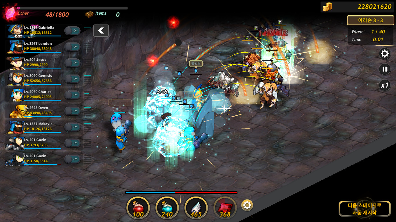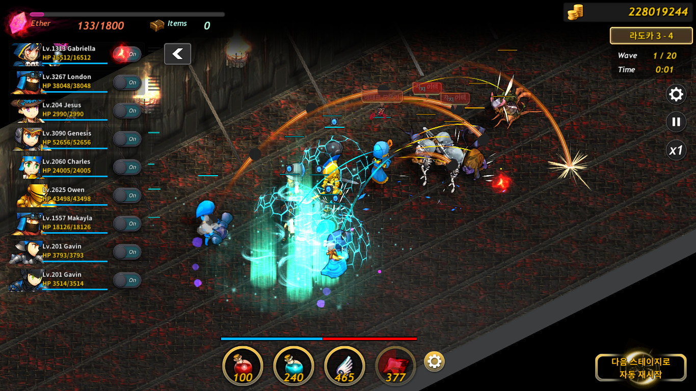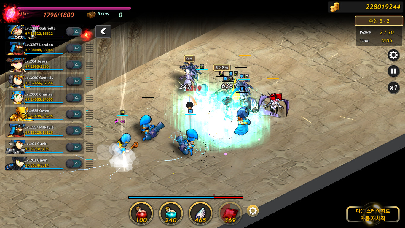 4. 전투에 돌입하고 나면 플레이어는 전투를 관전합니다. 필요에 따라 소모아이템을 사용해서 아군 유닛의 체력을 회복하거나 에테르를 회복시킬 수 있습니다.