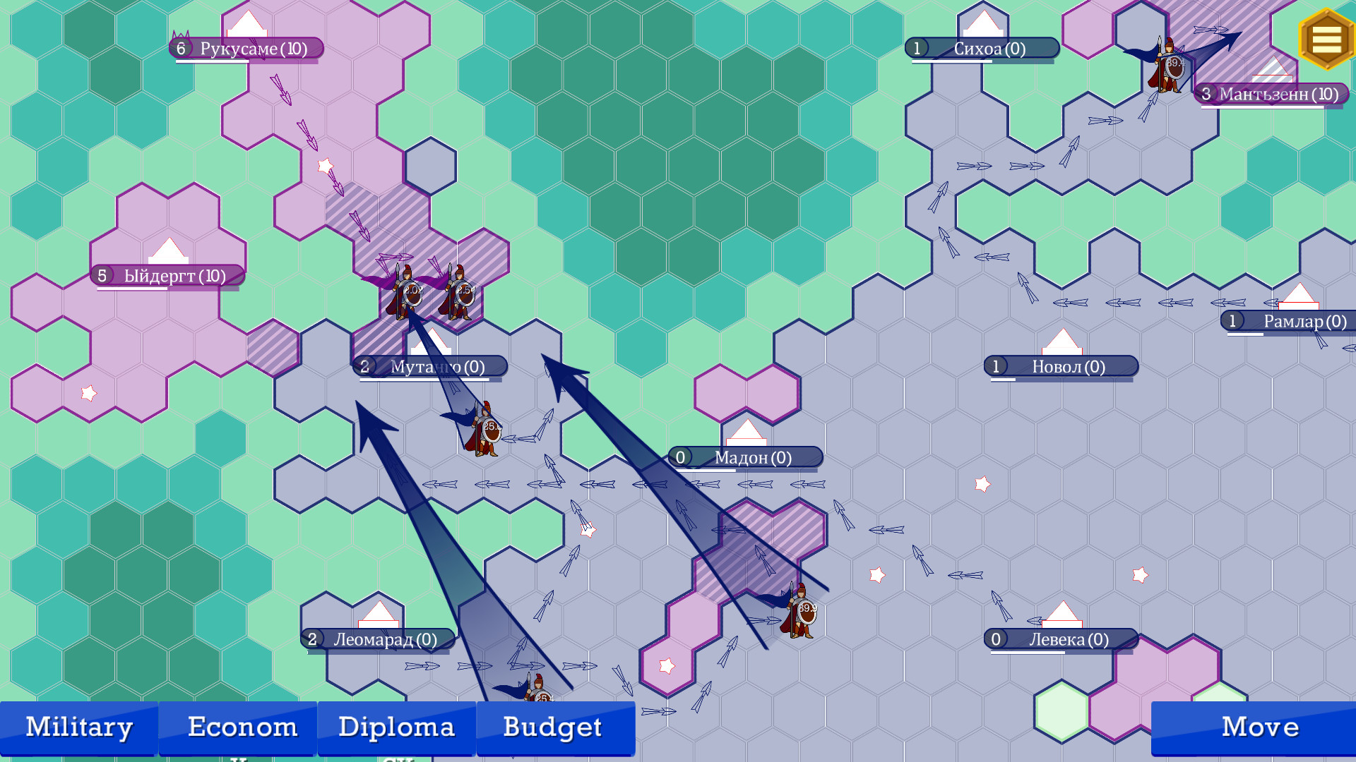 Conquicktory is a minimalistic turn-based strategy focused on top-level decisions in your civilization's development. You'll control the diplomacy relations with neighboring countries, declare wars, plan the key strikes and distribute funds to the peaceful/military issues. Your subjects will do the rest of work - there is no need to deeply micromanage all the aspect of your glorious growing empire.