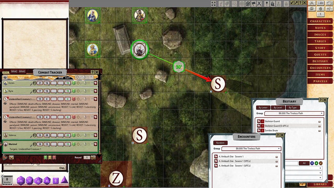 • Tokens for each encounter are all pre-placed in starting locations on the map. You can edit these on the fly.