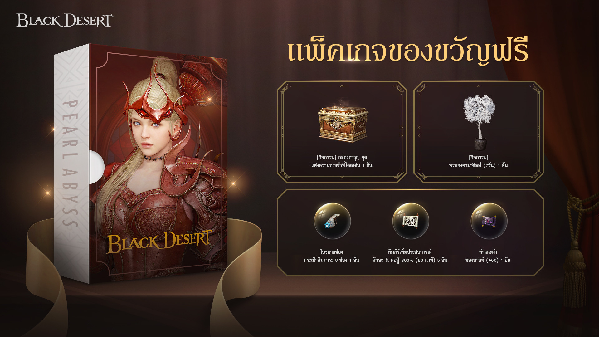- สามารถรับไอเทมฟรี (มูลค่าสูงสุดถึง 900 บาท) รวมถึงไอเทมบัฟ และชุดเครื่องแต่งกายสำหรับตัวละครของเหล่านักผจญภัยที่เริ่มการผจญภัยใน Black Desert พร้อมสินค้าแพ็คเกจดังกล่าว