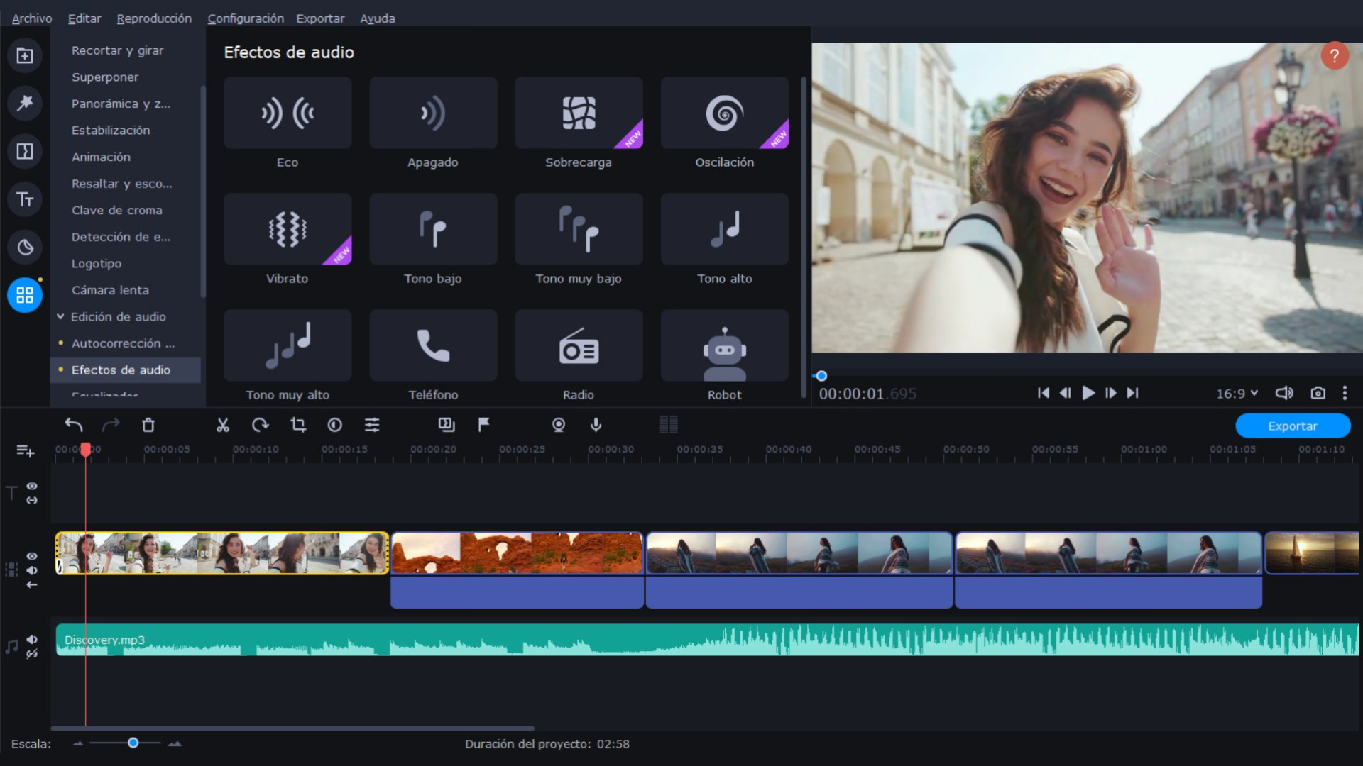 • Aplique efectos de audio: distorsione los sonidos, cree audio espacial y establezca el nivel de decibelios