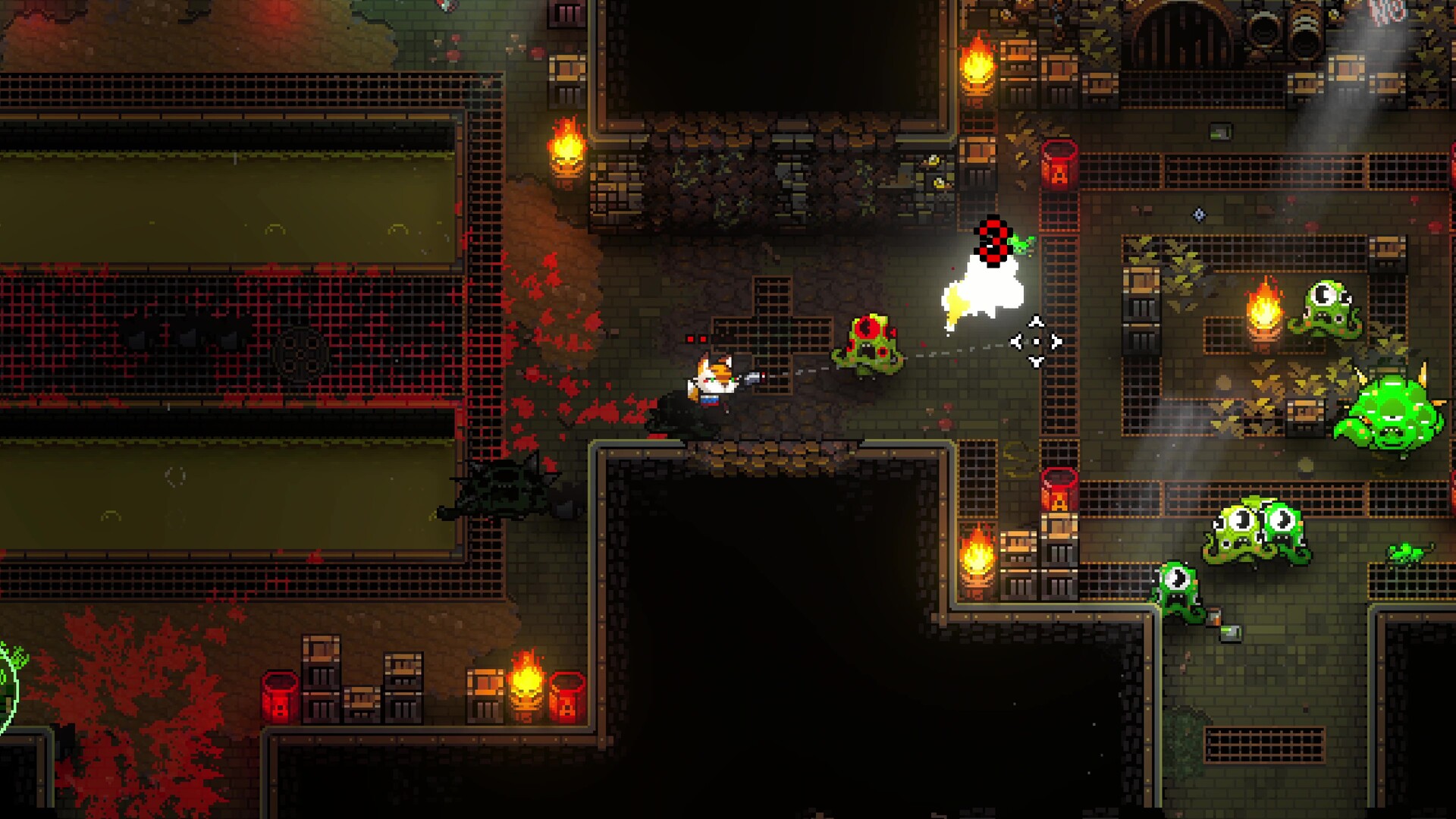 This game involves shooting & killing cartoonish pixel art figures with stylistic gore and blood.