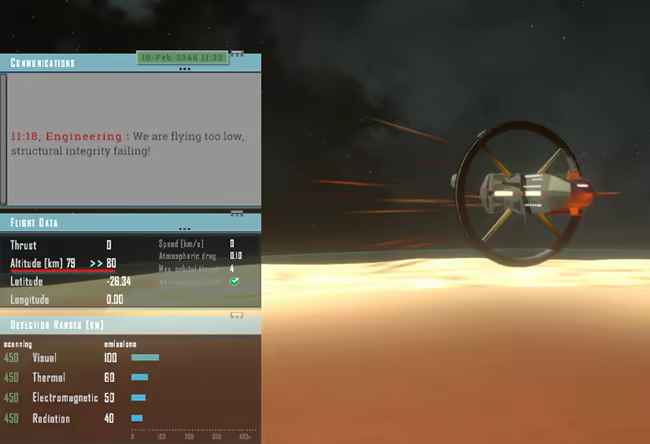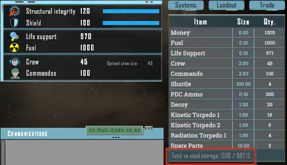 There is a basic inventory management with option to replenish it at certain conditions - when approaching space station or calling for support. The ship uses fuel and life-support items.