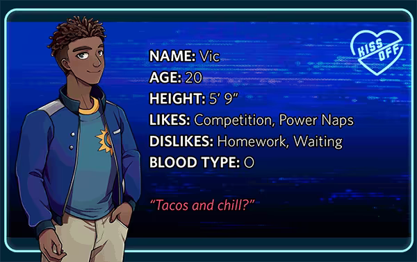 Play as Vic Powers: college track star, chill dude, and pansexual king. When he gets abducted onto the set of Kiss/OFF, he suddenly has a lot more to worry about than declaring his major. Now, he’s got to kiss a hottie, win the dating game, and find some way back to Earth!