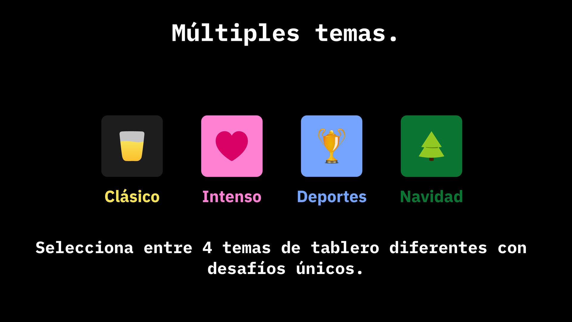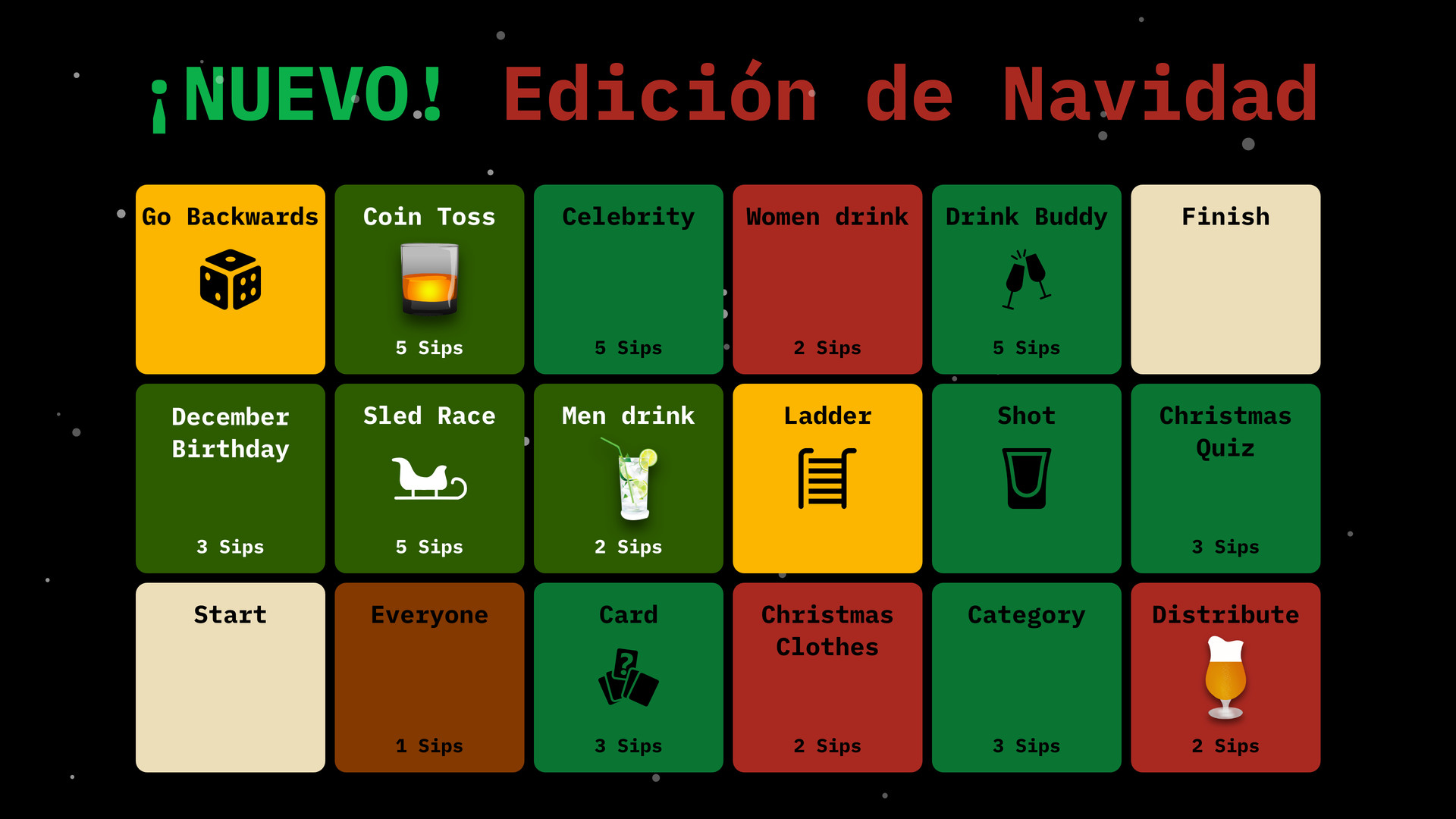 Además del clásico tablero de Drynk, los temas de Deporte, Caliente y Navidad permiten muchos más mini juegos de beber y aún más variedad en los diferentes temas.