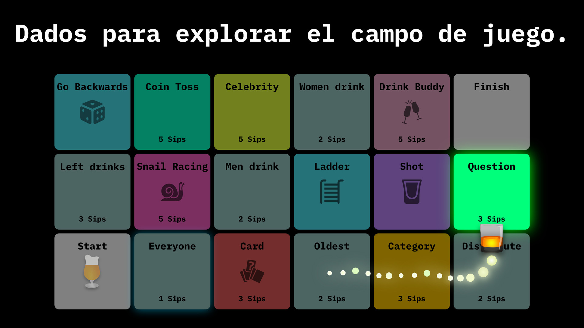 Cada ronda en Drynk consta de 40 campos diferentes que contienen tareas individuales.