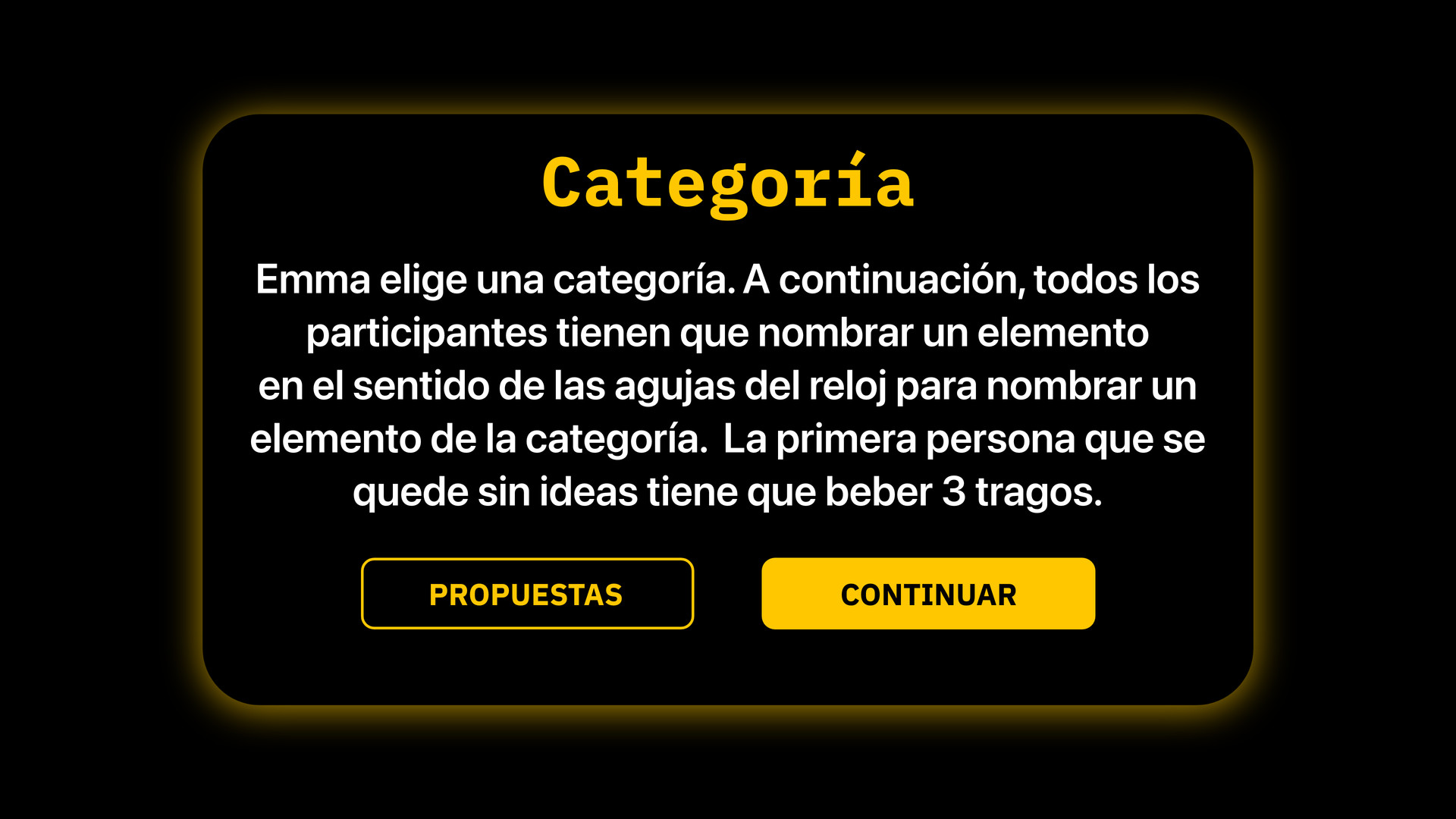 Todos los jugadores pueden elegir lo que tiene que hacer el jugador que ha saltado al campo. Si el jugador no acepta el reto, tiene que beber.