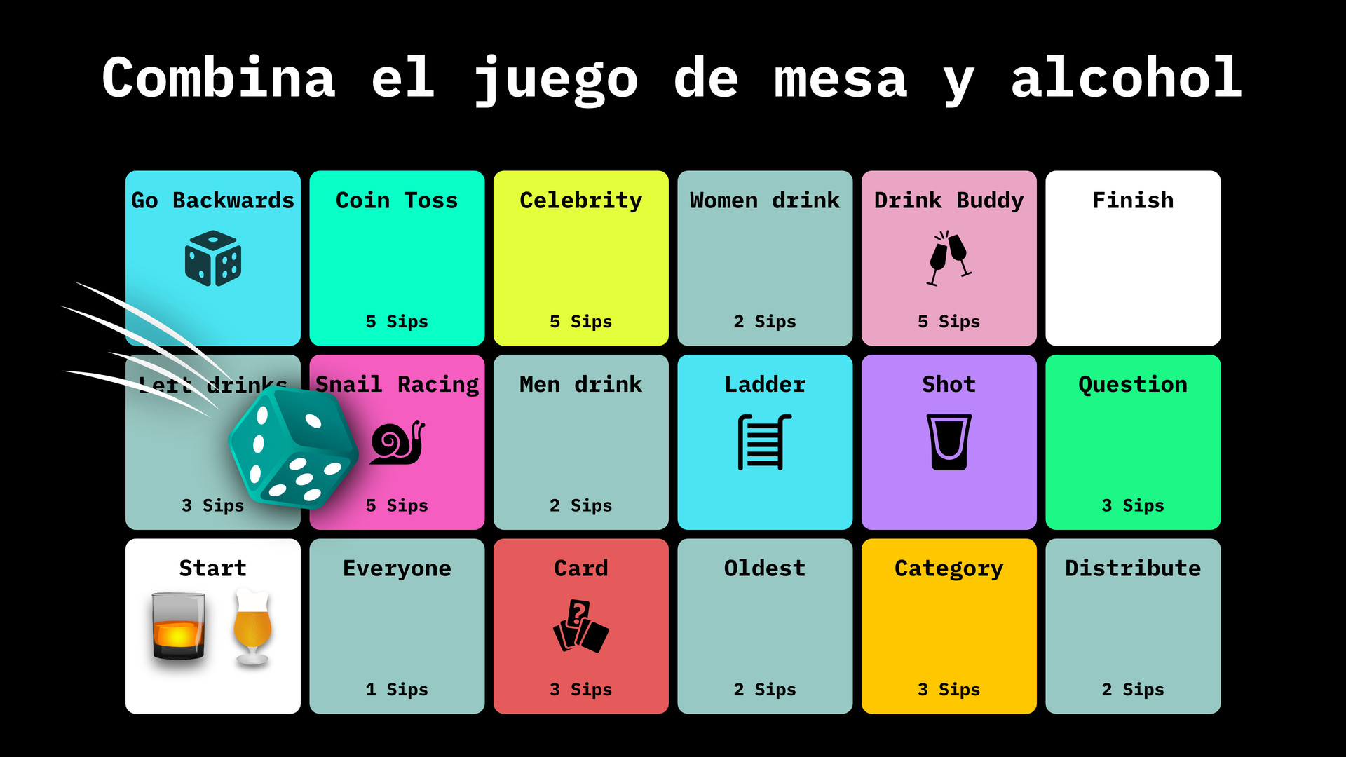 ¡Drynk es el juego de beber perfecto para jugar con tus amigos! Solo tienes que tirar los dados y explorar más de 40 retos diferentes en el tablero.