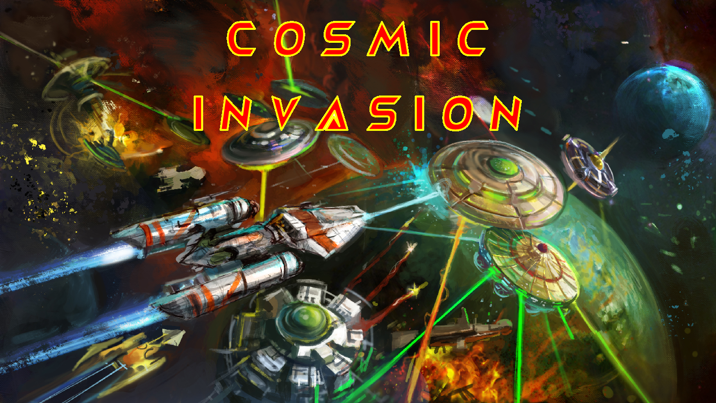 Cosmic Invasion is a combination of strategy mixed in with quick frantic battles against fleets that contain many ships. The strategic layer is a 20 X 30 grid with 600 sectors. Move your ships around to protect your home planet and space stations from the invading fleets of UFO ships.