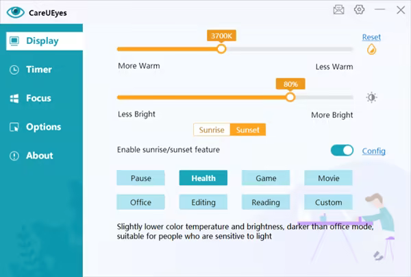 CareUEyes is a program specially designed for avid computer users. it is an eye care software with a blue light filter, brightness adjustment, break reminder, focus, etc., which protects your eyes in all directions and helps you easily discover enemies in the game, let you get The game's victory.