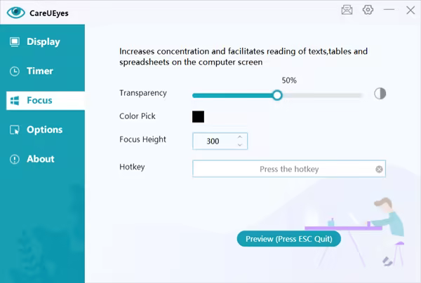 Allows you to customize the size and transparency of the reading area, so you can easily keep focused and improve work efficiency.