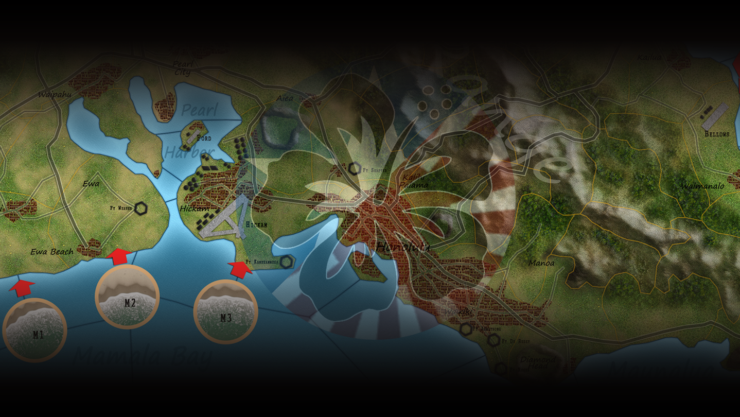 • As the Japanese, the crucial choice is that of the landing site. Close to Pearl Harbor, but under coastal batteries fire. Or north of the island, safe from damage and defense but far away. Or on the eastern shore, a possible good compromise between distance and difficulty. Will you send some surprise group to assault a fort? Or carry with you some artillery? Or let the fleet close in to get some extra gunfire support from the battleships?