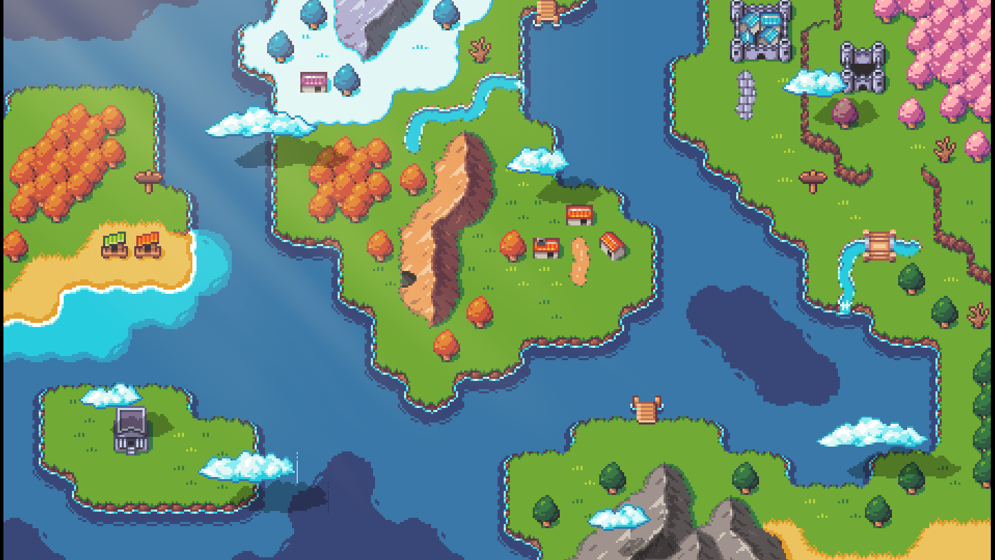 Welcome to the Super Retro World - Overworld Pack which features everything creators need for building their next great RPG world map. These tiles will help developers build their new worldmap with various biomes such as desert, snow, green valley, big mountains and deep waters. You'll find many variations in trees/houses/cities colors to match your needs !