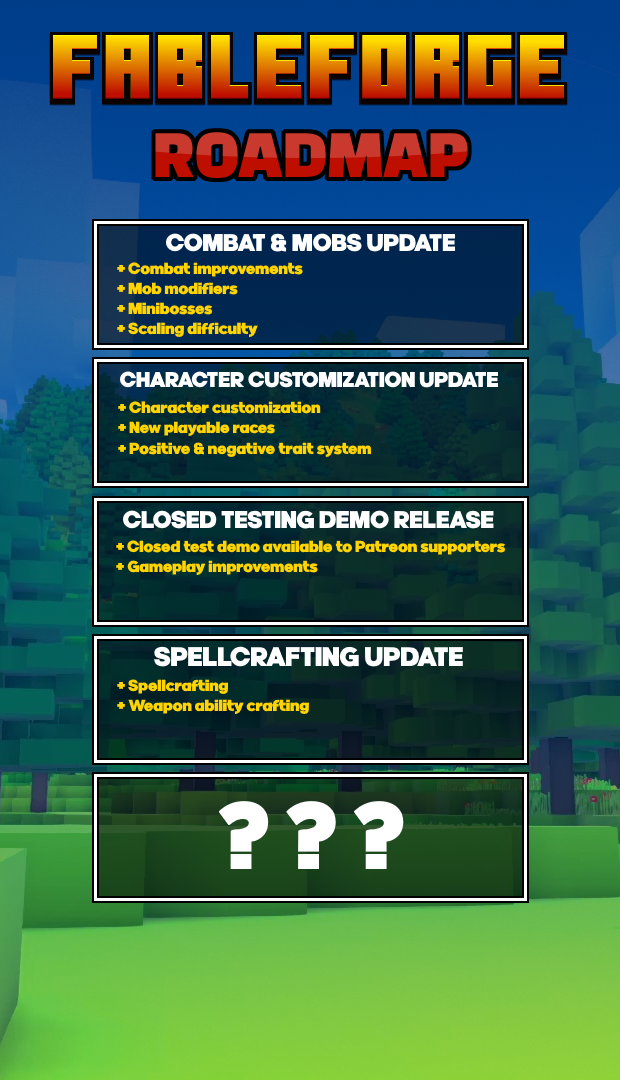 “Right now there's already quite a bit of features in the game, but there's a lot more planned for the full version like dungeons, quests, bosses, fishing, taming/mounts, and more. There's also a lot of planned content like more mob types, biomes, and playable races! The goal is to have a complete RPG experience with the full version.”