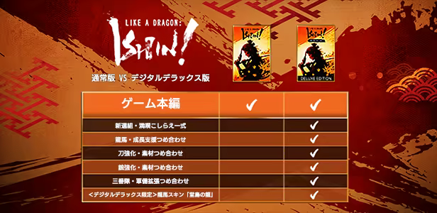 不朽の名作『龍が如く 維新!』が装い新たに登場! 本作では、“維新の英雄である坂本龍馬が、幕末最強の剣客集団・新選組に入隊していたら……”という壮大な物語が描かれます。 Unreal Engineで表現された美麗なグラフィックに加え、刷新されたシリーズオールスターキャラクターの共演、更に爽快感の増したバトルシステム、新規ミニゲーム等、あらゆる進化を遂げた「極」の名にふさわしいフルリメイク作品です。