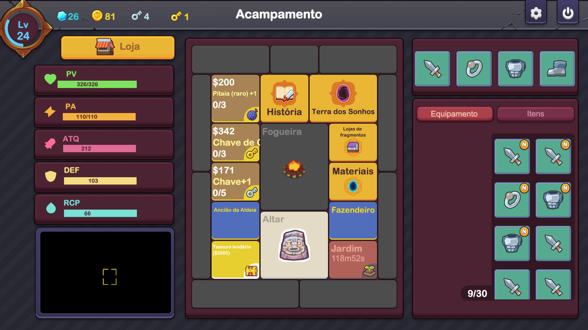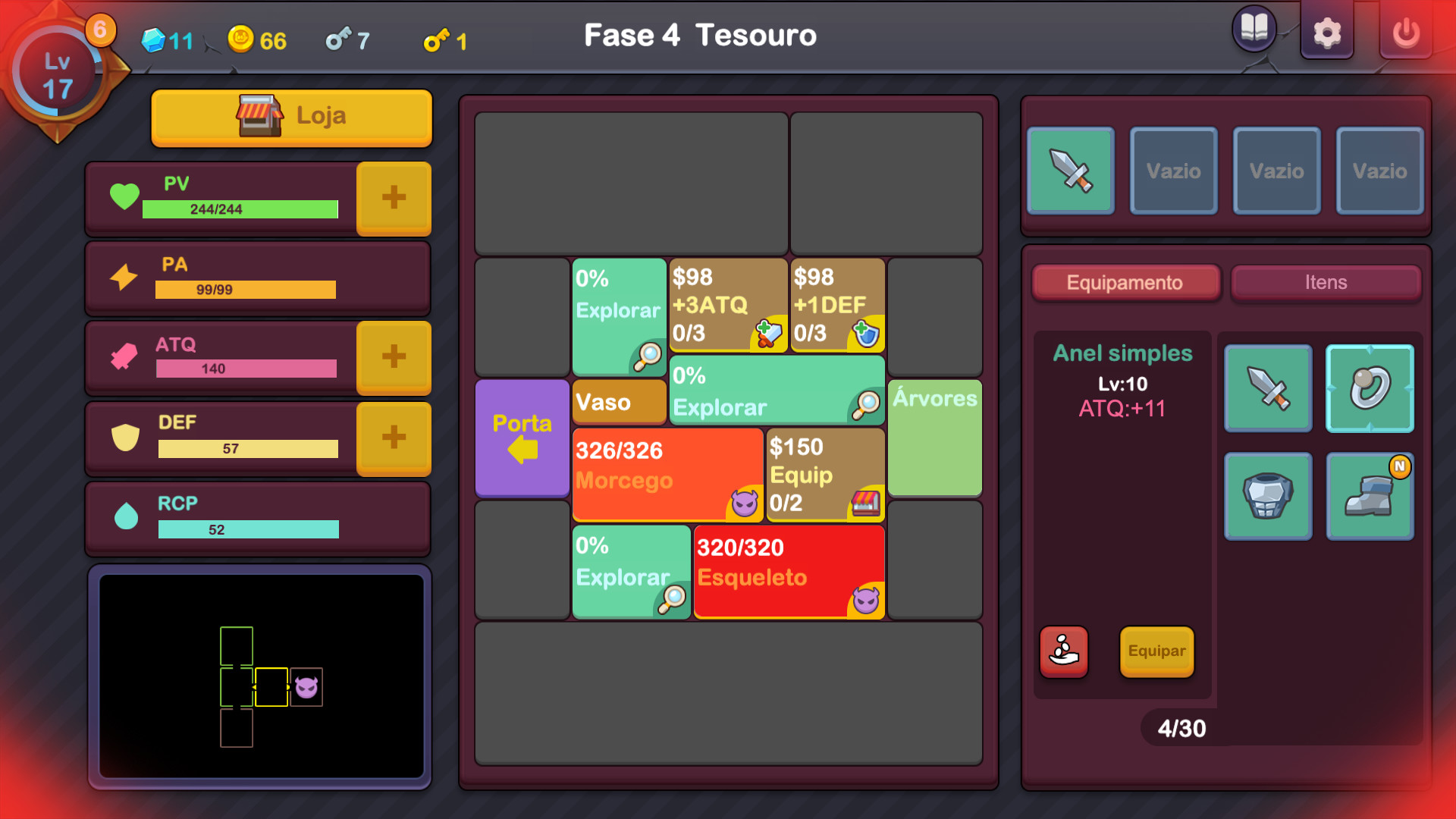 A Simple Dungeon Crawler of RPG. Várias salas são conectadas em masmorras. Tarefas, monstros e recompensas são simplificados em quadrados nas salas. Você pode apenas clicar nos quadrados para jogar e rastejar pelas masmorras.