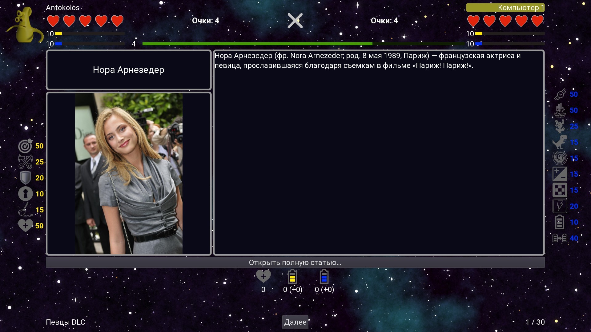Викторина содержит множество интересных фактов и изображений. Используя подсказки и антиподсказки, вы можете сформировать свою стратегию игры: помогать подсказками себе или мешать антиподсказками соперникам.