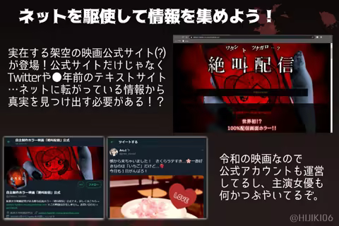 あなたはパルフォンが関係する都市伝説と「いわくつき」のホラー映画について調査を依頼されます。映画の公式サイトやSNSアカウントに隠された秘密を暴くためには、インターネットでの検索を駆使する必要があります。