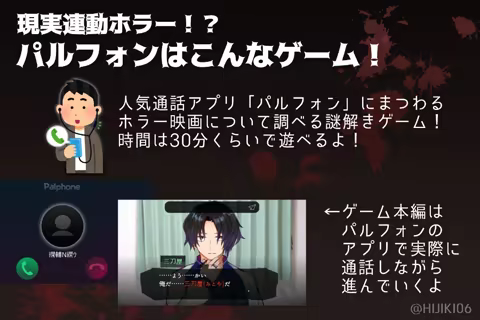 このゲームに登場するSNSアカウント、webサイトは、実在します―― インターネットを使って情報を集め、人気の配信アプリ「パルフォン」にまつわる都市伝説の真実に迫る。 都市伝説 × 新感覚ナラティヴ・ホラーアドベンチャーゲーム。