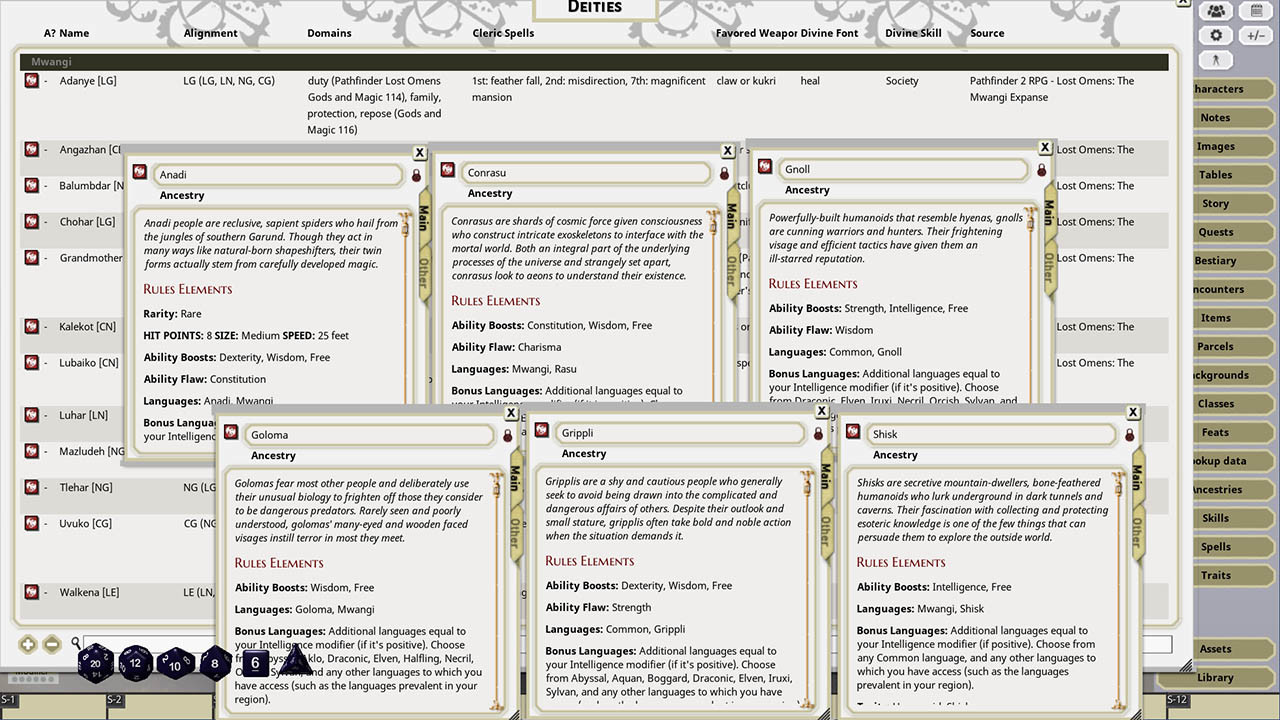 • Details on the Deities of Mwangi, their domains, granted spells, and more.