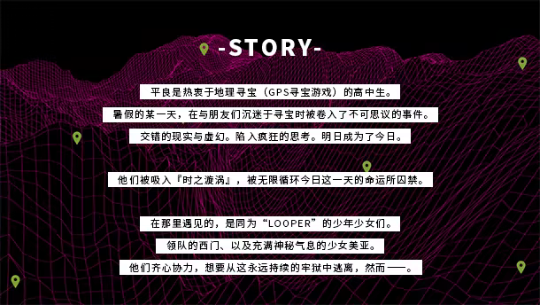 平良是热衷于地理寻宝(GPS寻宝游戏)的高中生。 暑假的某一天,在与朋友们沉迷于寻宝时被卷入了不可思议的事件。 交错的现实与虚幻。陷入疯狂的思考。明日成为了今日。