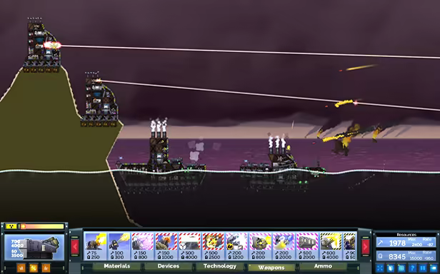 The classic proprietary physics engine Forts is known for has received a major upgrade with the addition of the new water system. Ships float with true buoyancy, listing to one side if off-balance. Any structure not connected to a reactor will sink to the ocean floor unless reconnected swiftly. The ocean surface features its own set of splash FX, water and bubbles particles, underwater explosions and sound effects. This tech opens up a whole new world of possibilities of gameplay and modding to an already very satisfying physics-based experience!