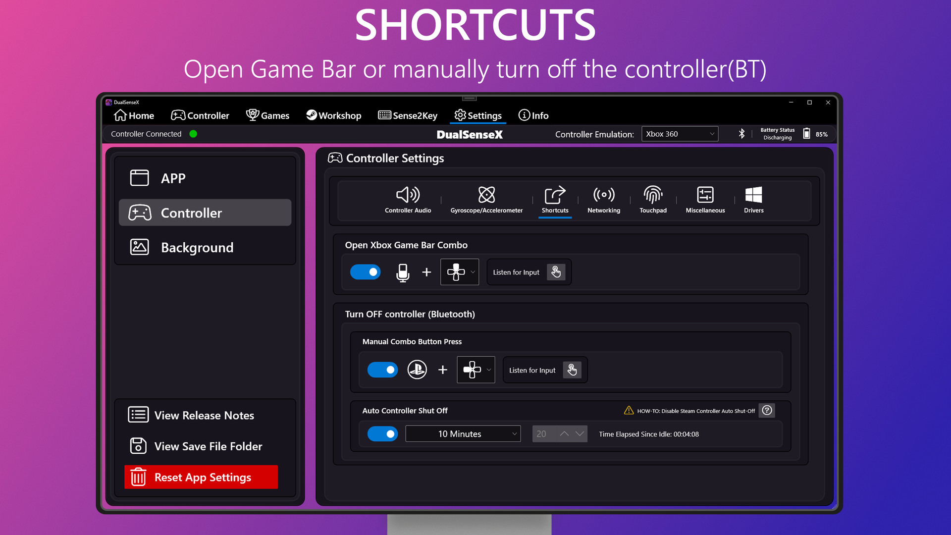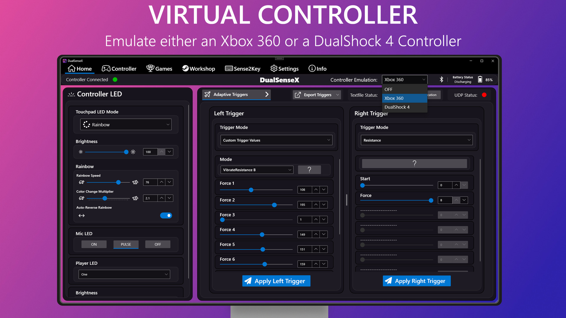 Bring your DualSense Controller to life! Use 20 different Adaptive Trigger modes, enable Haptic Feedback(USB), Emulate Xbox 360 or DualShock 4 through USB or Bluetooth on PC.